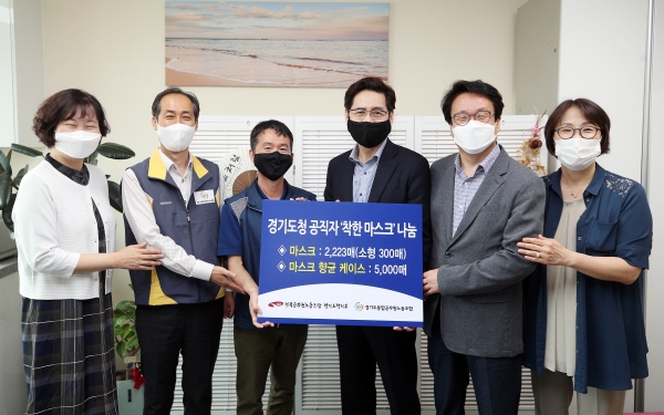 경기도청 공직자 ‘착한 마스크’ 기부 ▲ (왼쪽에서 두 번째 백승진 경기도통합공무원노동조합 위원장, 왼쪽에서 세 번째 윤석희 전국공무원노동조합 경기도청지부장, 왼쪽에서 네 번째 박춘배 지역사회보장협의체 회장.) /경기도 제공 [경인종합일보 김형천 기자] 경기도청 공직자 ‘착한 마스크’ 기부 5일 오전 경기도청의 전국공무원노동조합 경기도청지부 사무실에서 윤석희 전국공무원노동조합 경기도청지부장과 백승진 경기도통합공무원노동조합 위원장이 박춘배 지역사회보장협의체 회장에게 경기도청 공무원들이 기부한 보건용 마스크 2,223장과 마스크 향균 케이스 5,000장을 전달하고 관계자들과 함께 기념촬영을 하고 있다.